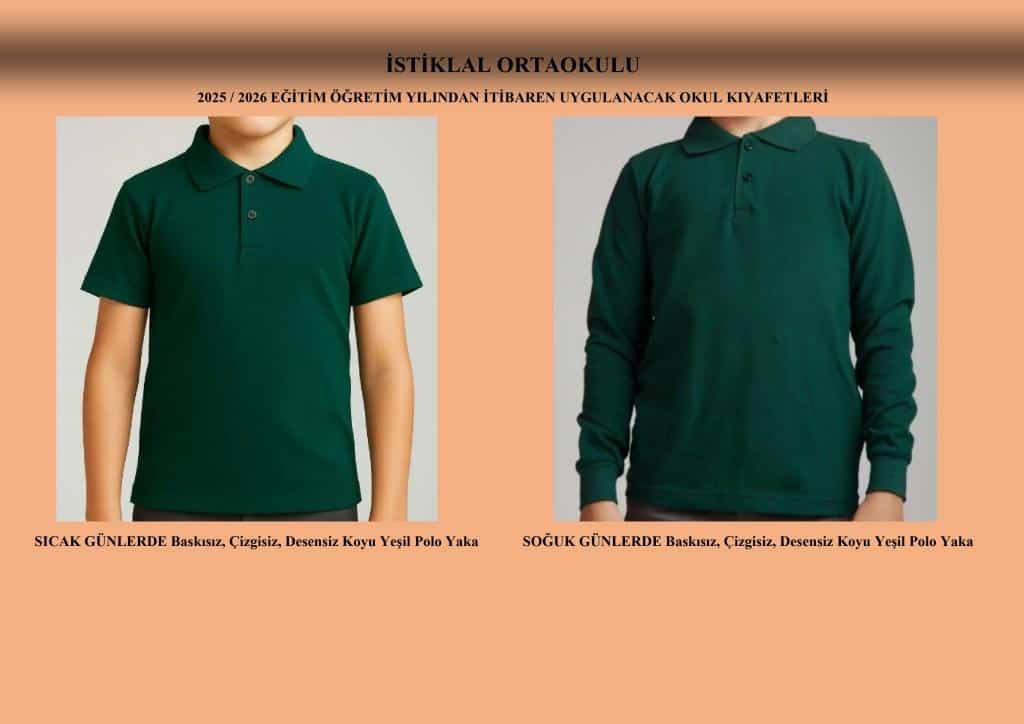 Hem Kız hem de Erkek öğrencilerimiz bundan böyle 2025 / 2026 Eğitim Öğretim Yılı Eylül ayından itibaren Koyu Gri Pantolon, Koyu Yeşil Polo Yaka Kısa Kollu Tişört (Lakos Yaka) ve soğuk günlerde ise Koyu Yeşil Polo Yaka Uzun Kollu Tişört (Lakos Yaka) giyecektir.