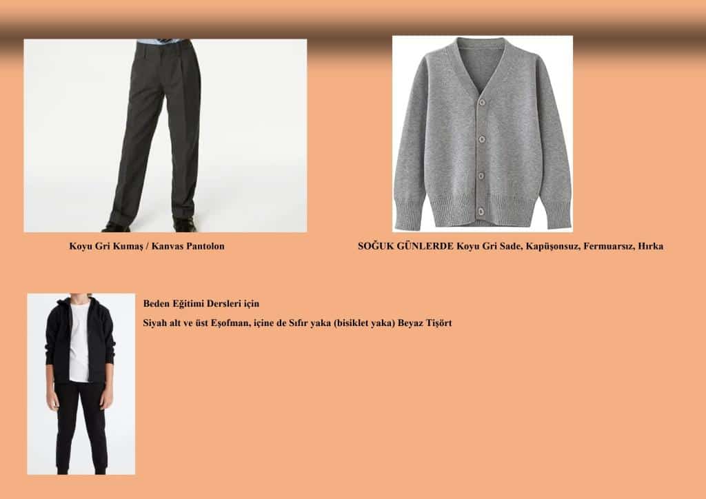 03.02.2025 tarihinde yapılan Öğretmenler Kurulumuzda alınan karar ve Okul Aile Birliğimizin 05.02.2025 tarihinde yapılan toplantısında alınan kararı gereği gelecek eğitim öğretim yılından itibaren (2025 / 2026) aşağıdaki resimlerde görülen logosuz, çizgisiz, desensiz kıyafetler Öğrenci Kıyafeti olarak belirlenmiştir.
